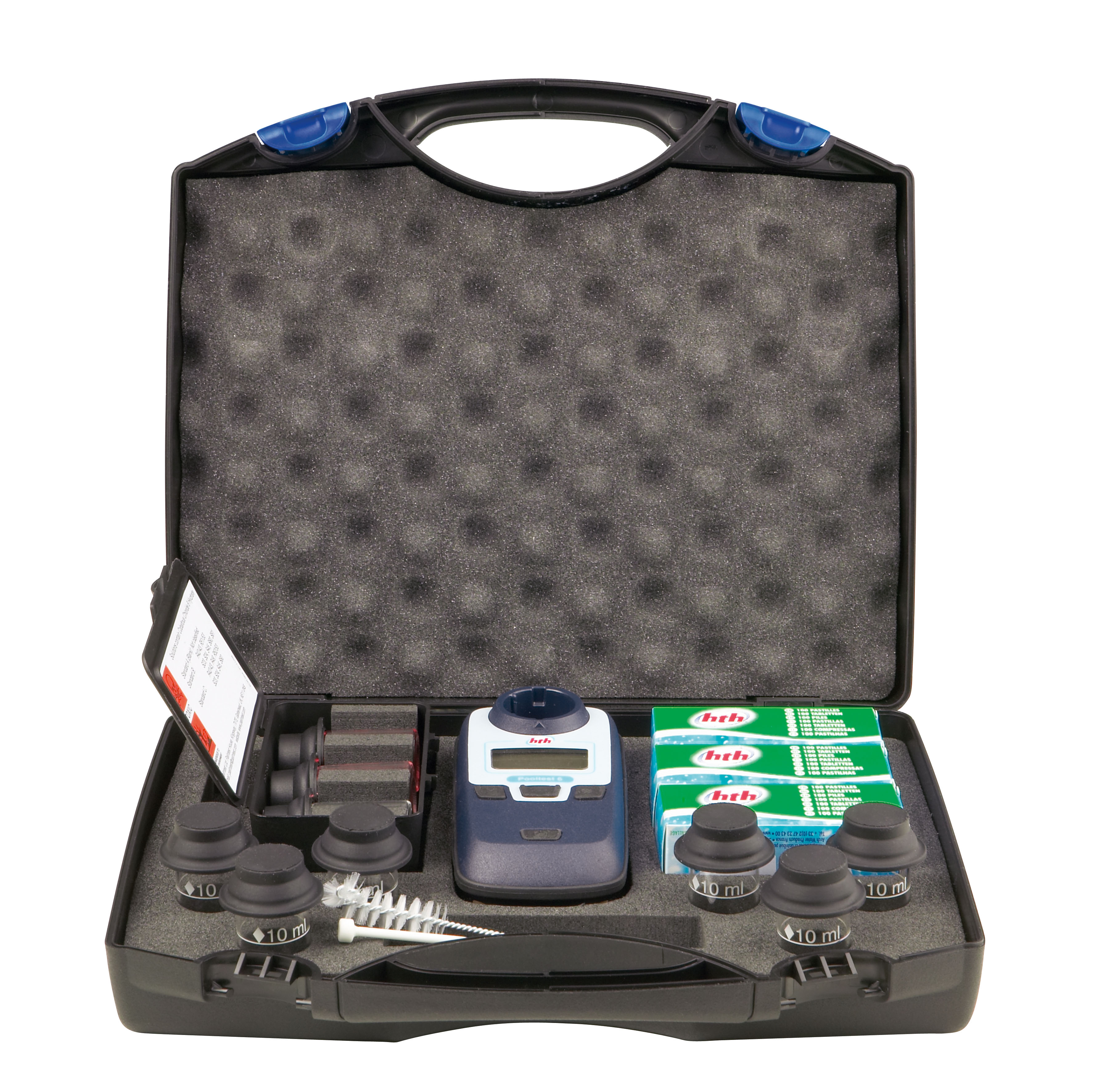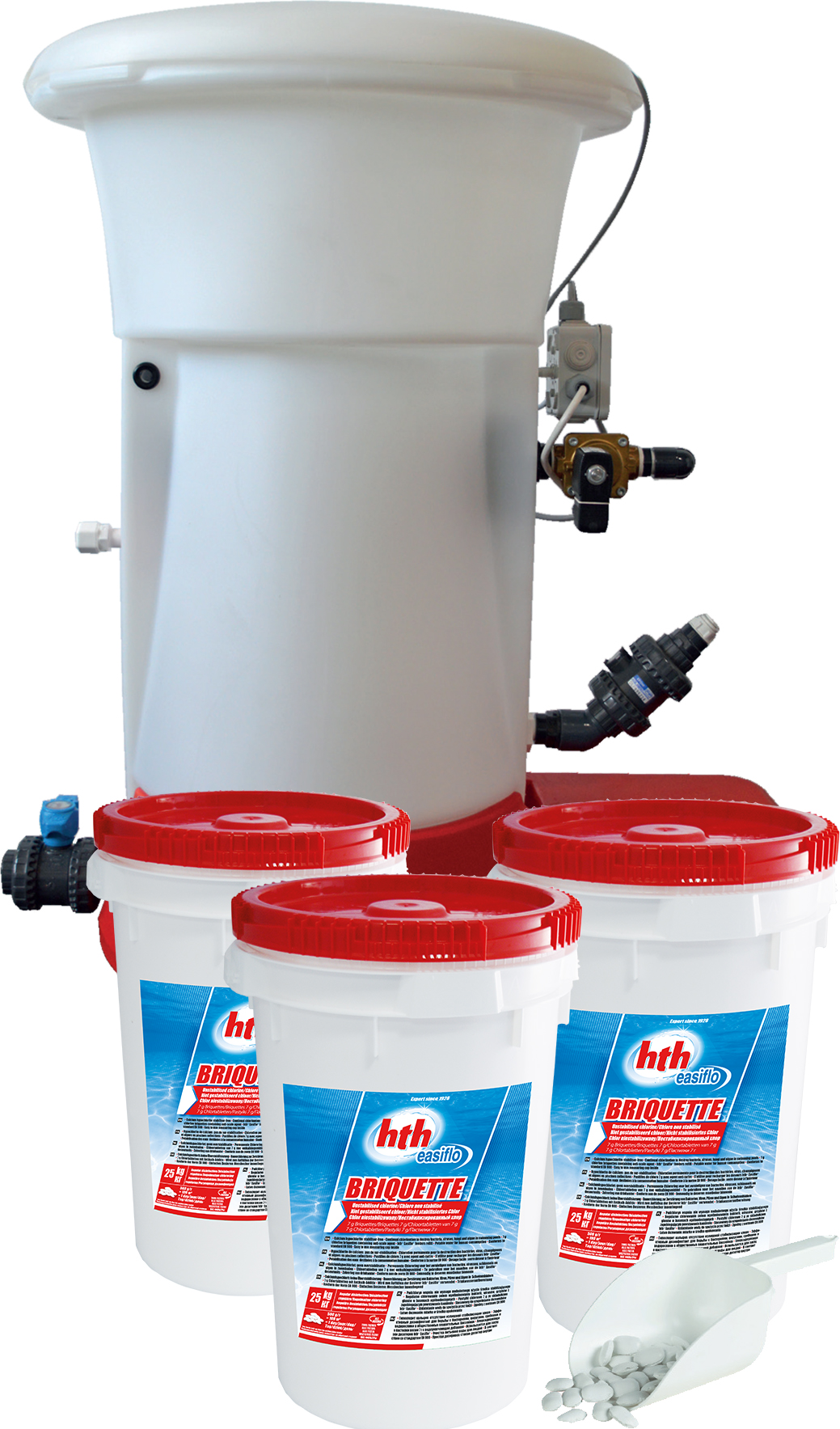 en étant combiné avec les hth® Easiflo briquettes, produit sur site et à la demande une solution chlorée pour la désinfection de l’eau de votre piscine.